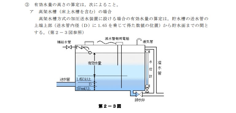 | オム様 有効容量の件、確認してみたところ平成30年版→令和3年版の間で有効容量に関して変更がかかったのを確認しました。 想定していた容量よりだいぶ少なくできるようです。 最終的には消防確認ですね。 ありがとうございました! |